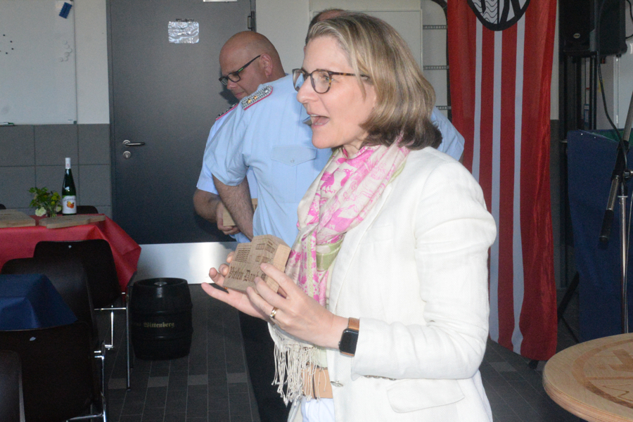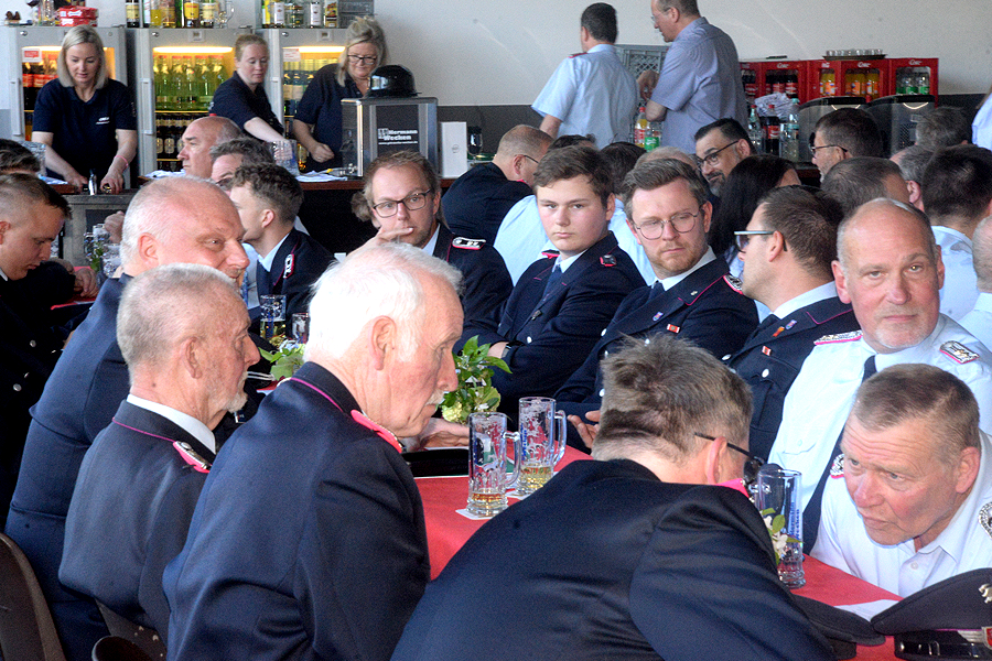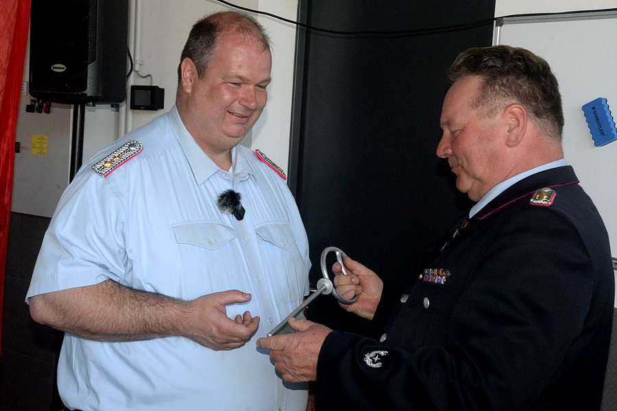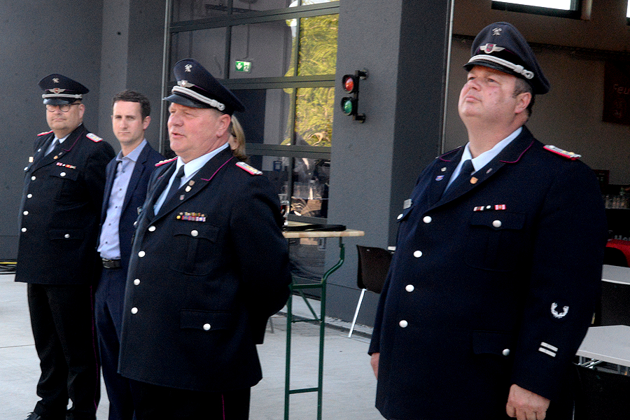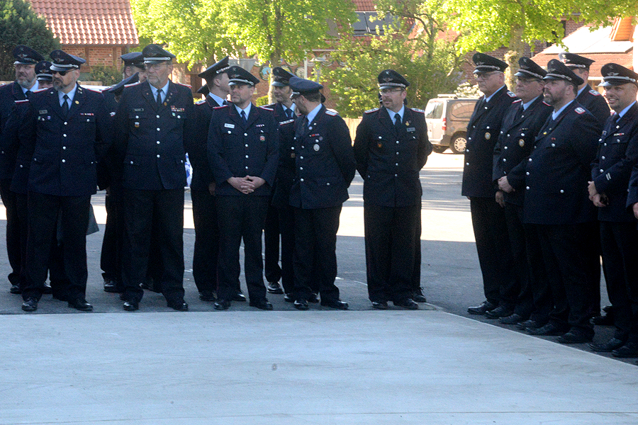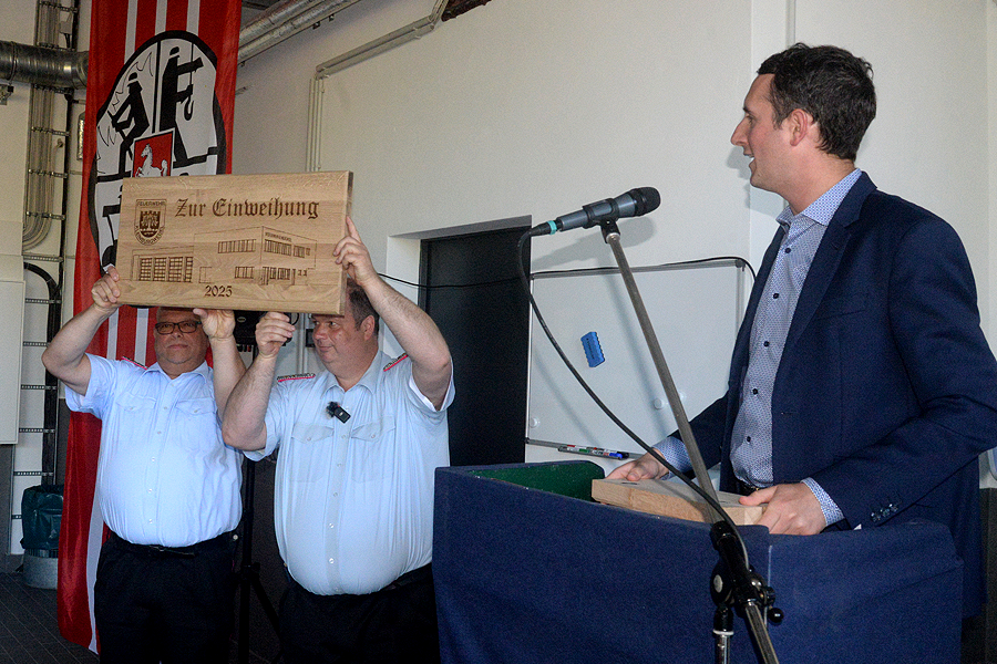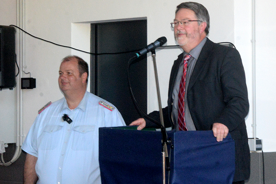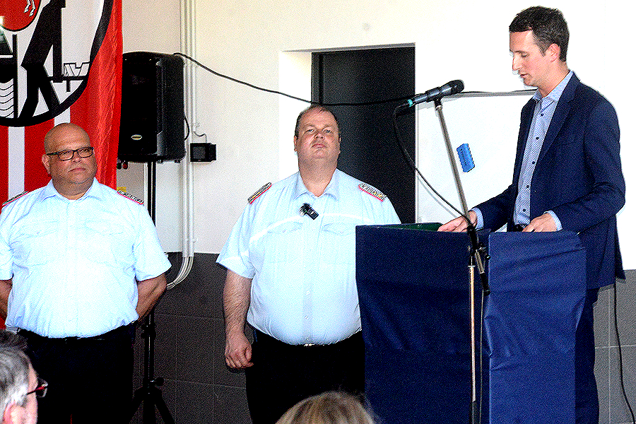 Nach der Begrüßung der Feuerwehrleute und der Gäste, darunter zahlreiche Ehrengäste wie Bürgermeisterin Ortrud Wendt, Ortsbürgermeister Lars Wöhler, Stadtbrandmeister Carsten Rüdiger und Brandschutzabschnittsleiter Volker Kluth, ließ Florian Leisenberg zunächst die Geschichte des neuen Hauses Revue passieren. „Alle am Bau beteiligten Firmen haben eine Superarbeit geleistet“, sagte der Ortsbrandmeister. „So ein Bauwerk erlebe ich zum ersten Mal“, rief er seinen Feuerwehrkameraden zu: „Fühlt euch hier wie zu Hause und wohl.“ Es sei wichtig gewesen, so großzügig zu bauen, der Entschluss damals für dieses Haus sei richtig gewesen. „Wir können hier mit großen Flächen arbeiten, das Haus ist funktionell und richtig, richtig schön.“ In diesem Gebäude stecke auch viel Herzblut. Das Haus sei kein Selbstzweck, die Feuerwehr könne hier professionell, aber auch traditionell wirken.