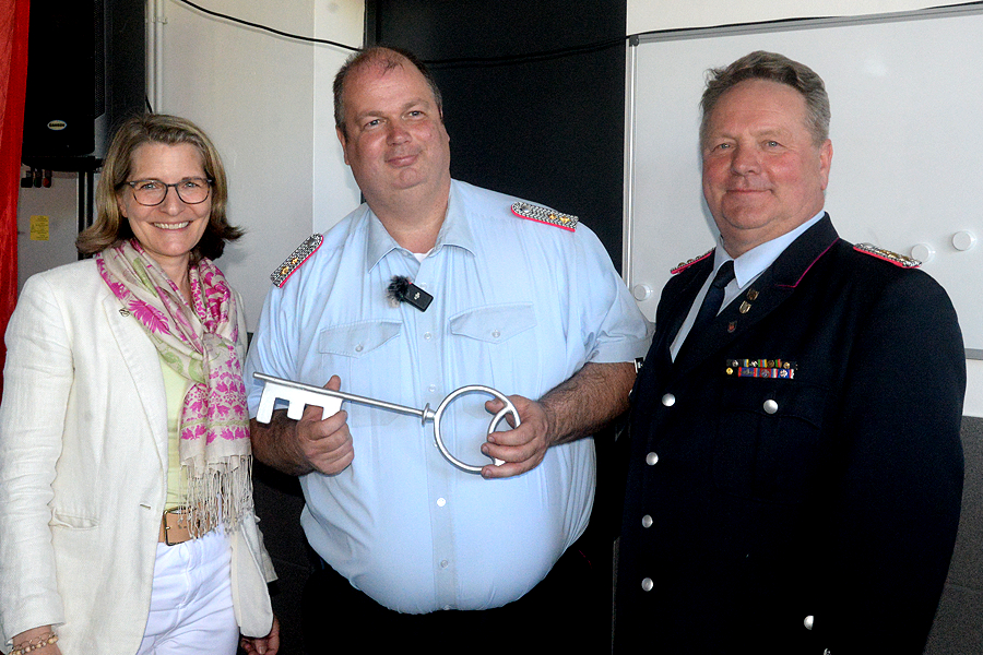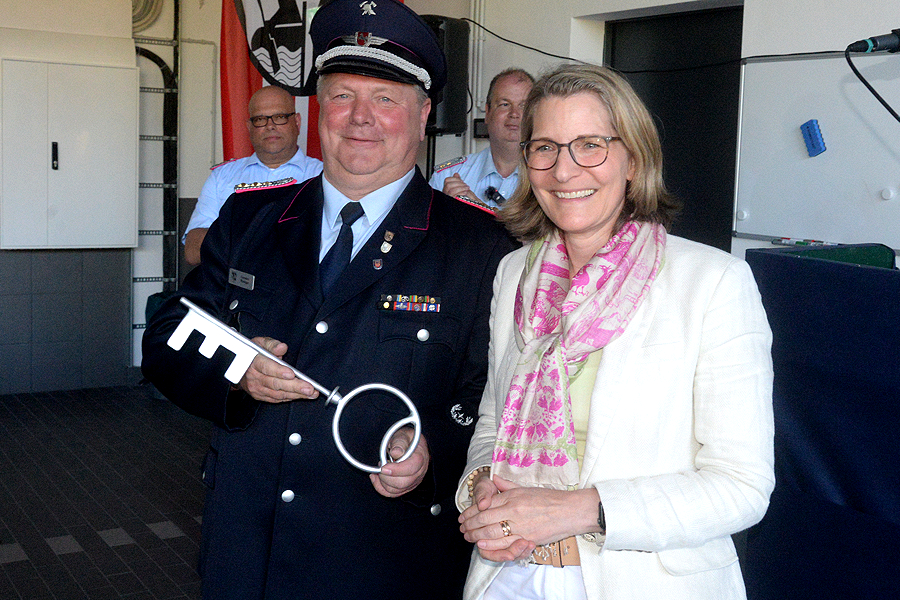 „Das Haus ist zu 95 Prozent fertig, wir können stolz auf diesen Bau sein“, sagte in seiner Begrüßungsrede Ortsbrandmeister Florian Leisenberg. Später übernahm er von Stadtbrandmeister Carsten Rüdiger und Burgwedels Bürgermeisterin Ortrud Wendt symbolisch den Schlüssel für dieses Bauwerk.