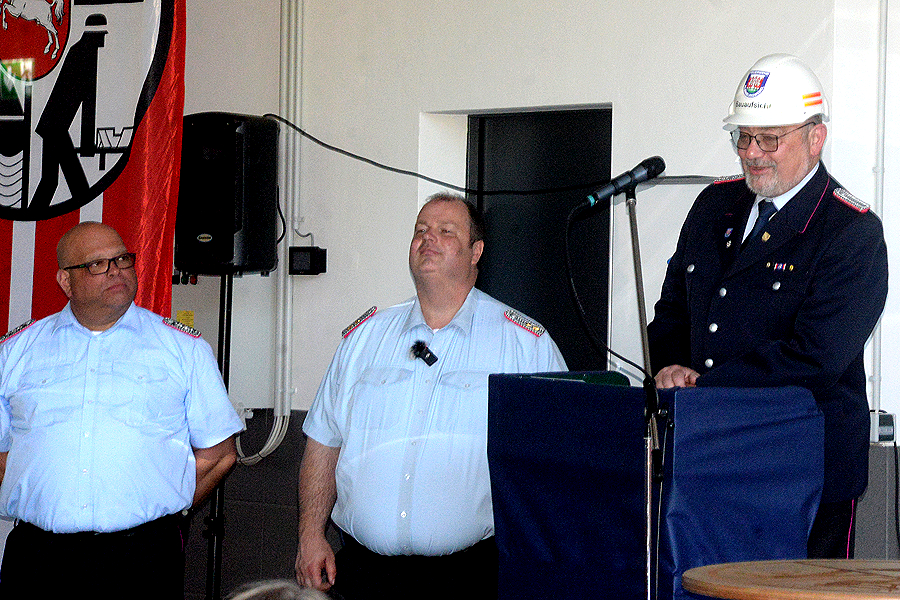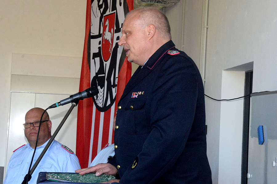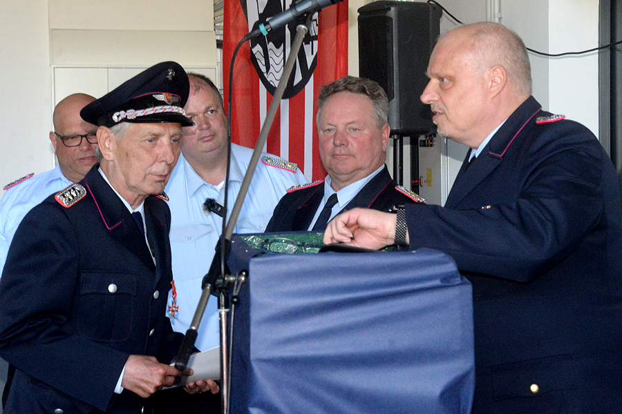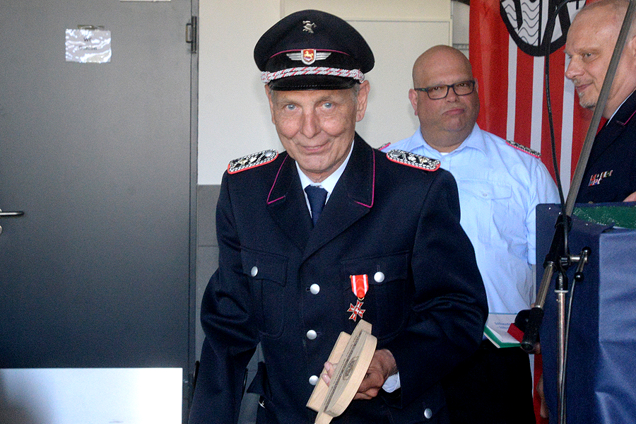 Stadtbrandmeister Carsten Rüdiger betonte: „Das ist heute für uns ein historischer Tag.“ Alles ist gut gelaufen, das Geld für dieses Haus ist sinnvoll eingebracht. Brandschutzabschnittsleiter Volker Kluth nutzte dieses Ereignis in Kleinburgwedel, um einen verdienten Feuerwehrmann aus dem Ort auszuzeichnen: Werner Lindemann, der seit Jahrzehnten in der Ortswehr aktiv gewesen ist, unter anderem auch in der Ausbildung, erhielt das Feuerwehr-Ehrenabzeichen des Landes Niedersachsen.