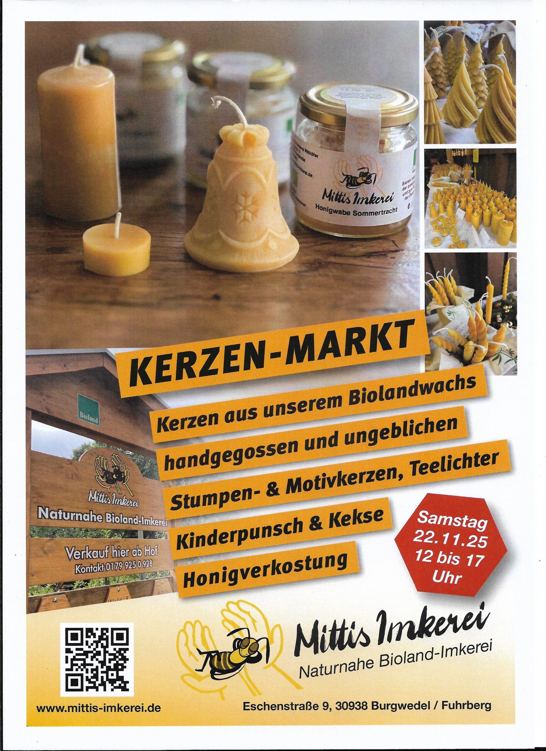 Die Bioland-Imkerei in der Eschenstraße 9 in Fuhrberg lädt am kommenden Sonnabend, 22. November 2025, von 12 bis 17 Uhr zu einem wettergeschützten Kerzenmarkt ein.