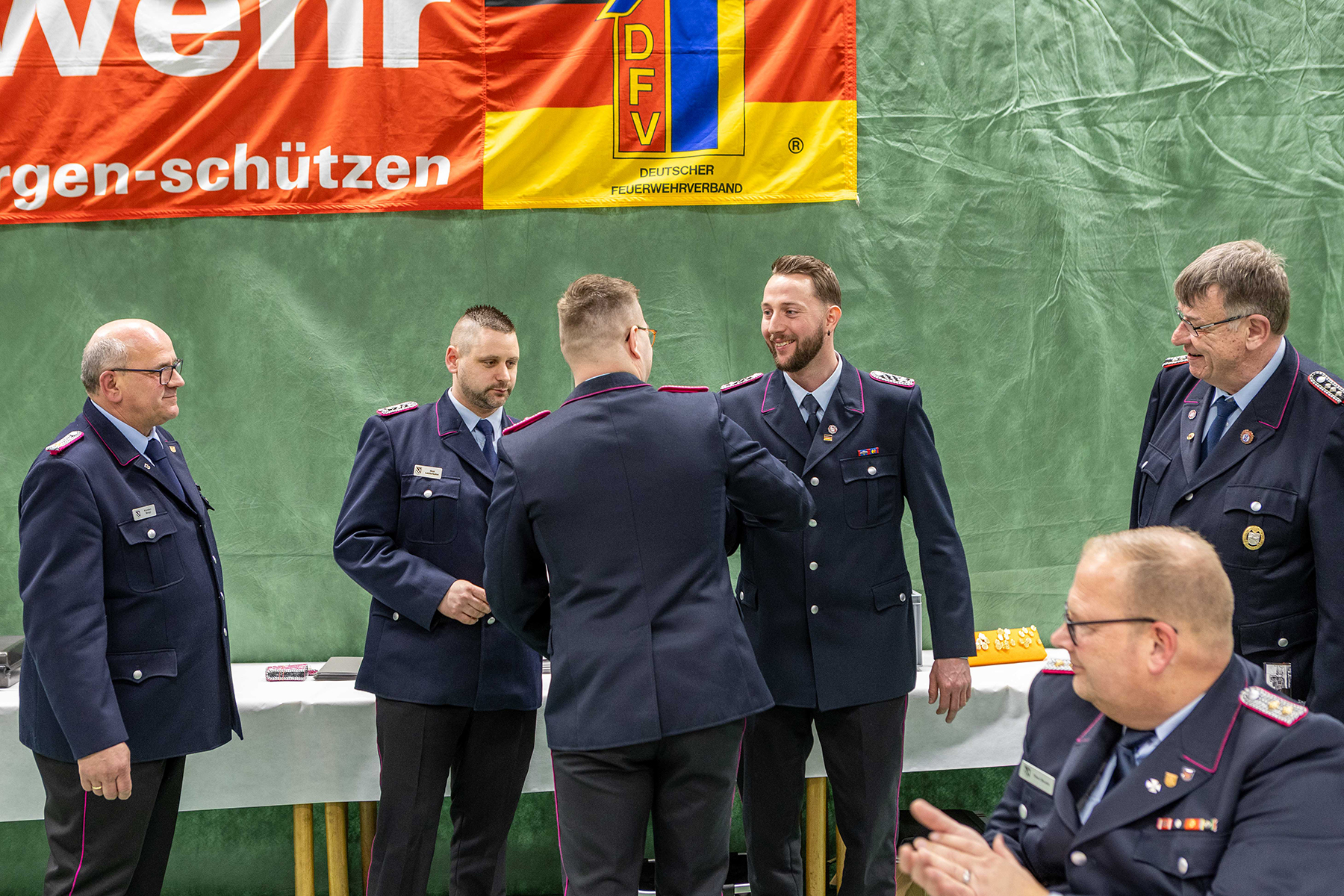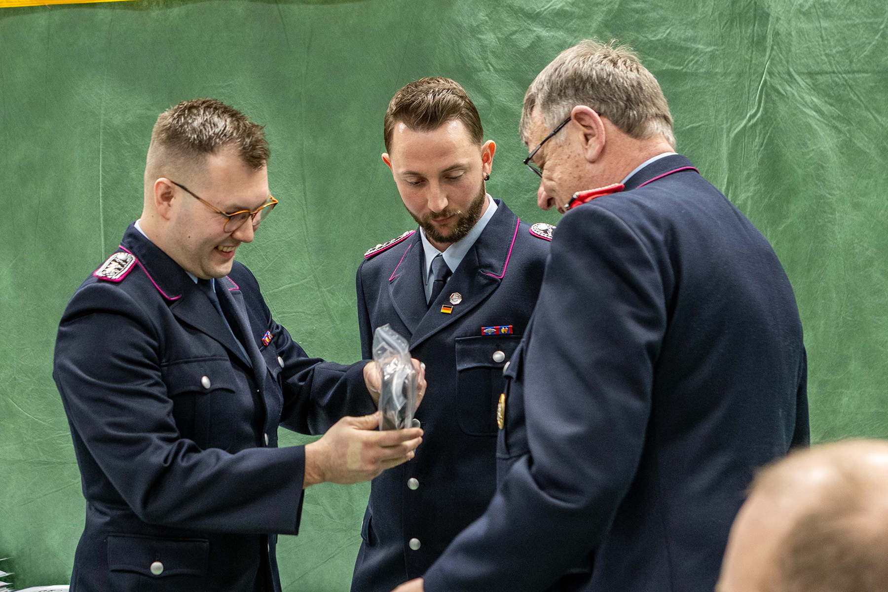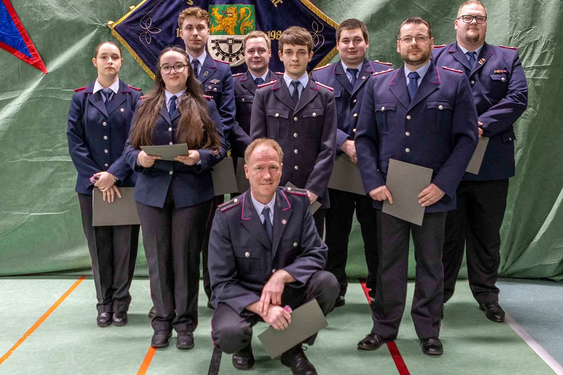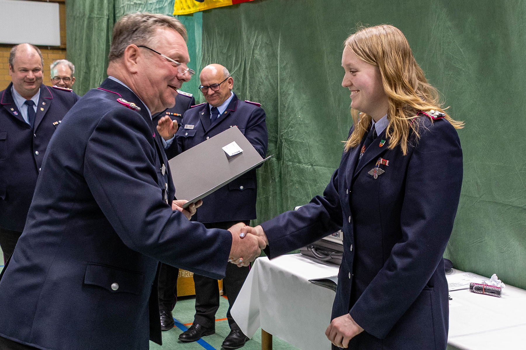 Neue Dienstgrade erhielten: Jens Schmidt (Feuerwehrmann), Fabian Sonneborn (Feuerwehrmann), Fenja Steinberg (Feuerwehrfrau), Lukas Mönkemeier (Oberfeuerwehrmann), Nils-Thorben Schrader (Oberfeuerwehrmann), Florian Hanne (Oberfeuerwehrmann), Sven Wimmer (Hauptfeuerwehrmann), Jonas Jungnickel (Hauptfeuerwehrmann), Jens Weisner (Erster Hauptfeuerwehrmann), Lea-Sophie Iser (Löschmeister) und Nick Ledderbohm (Brandmeister).