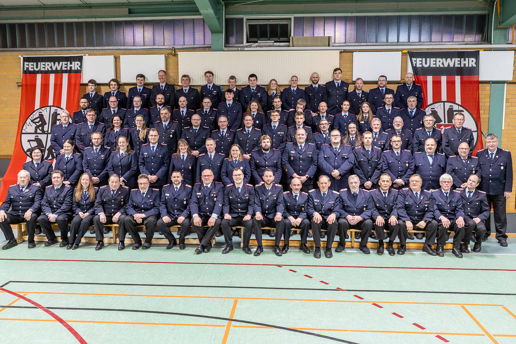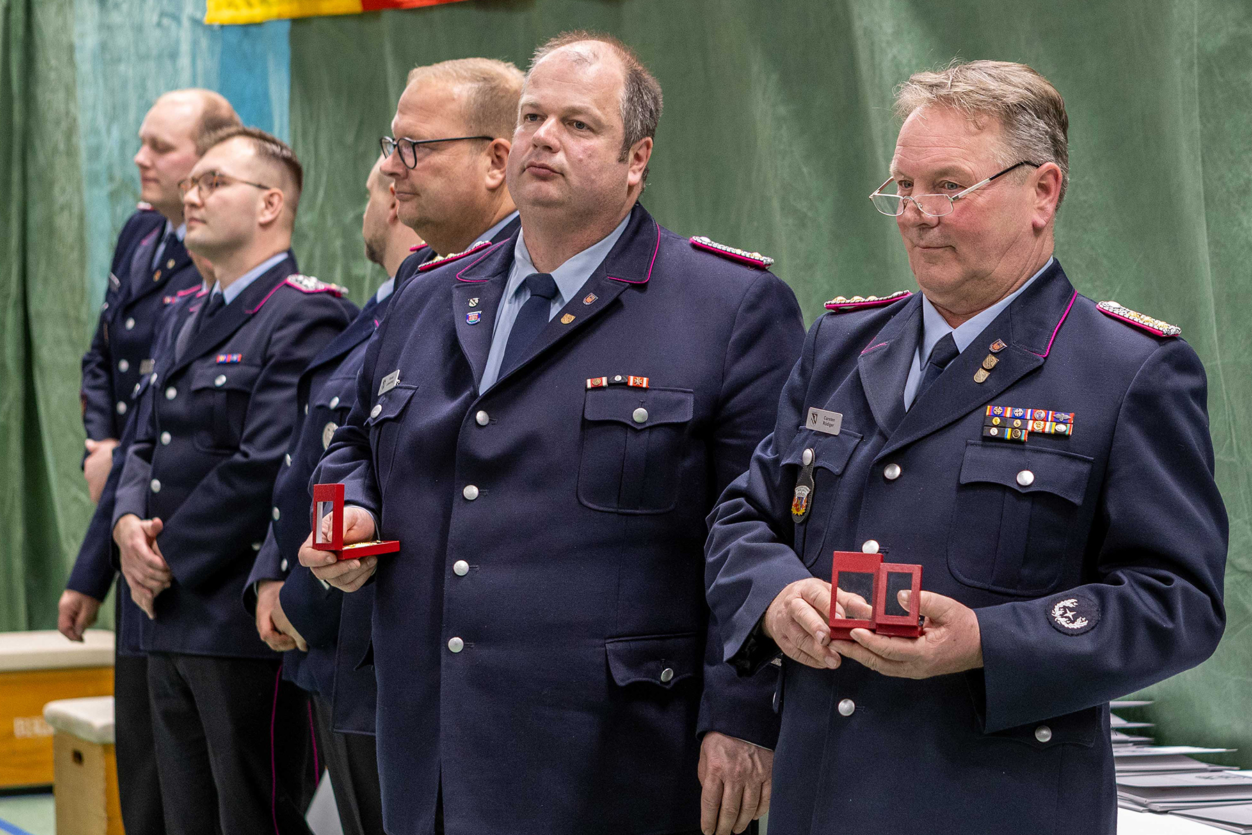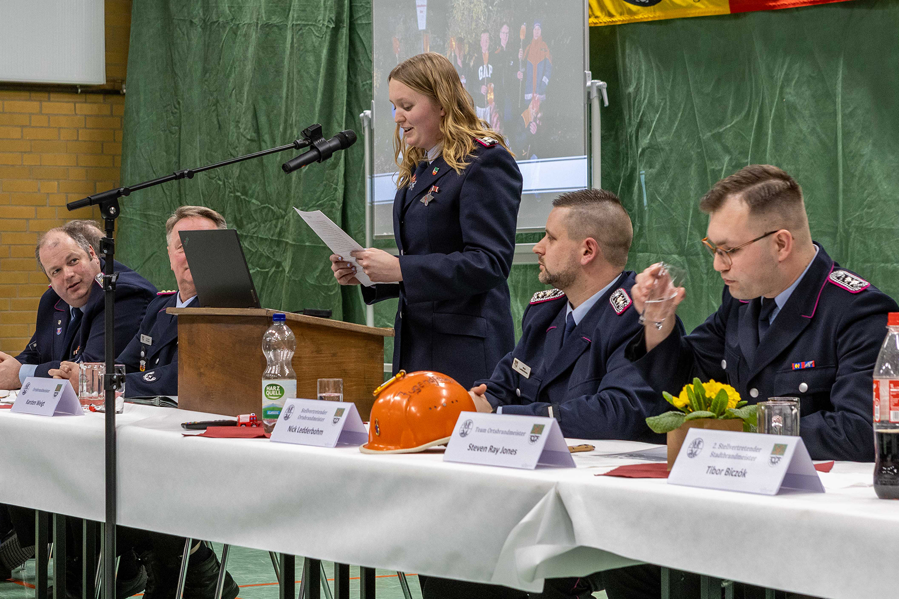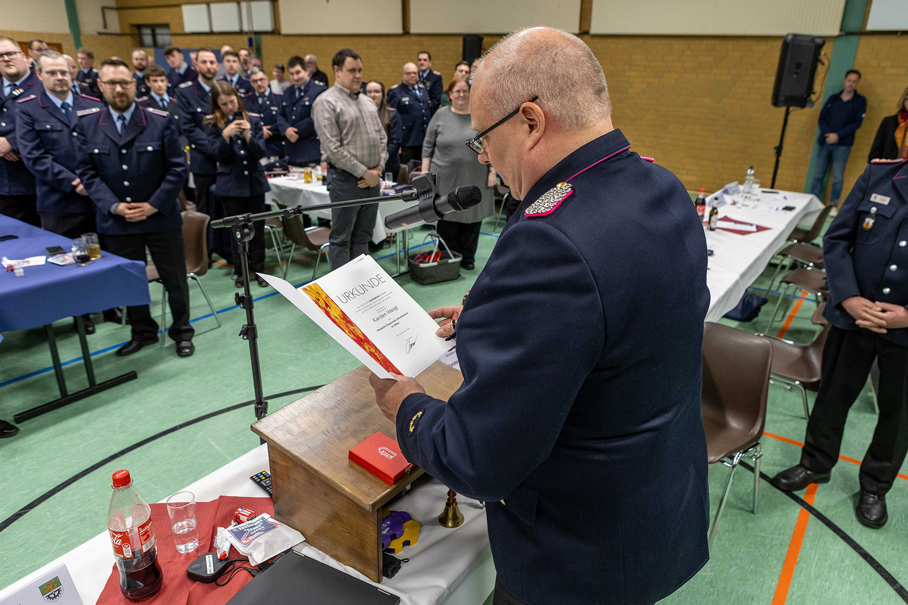 Neue Dienstgrade erhielten: Jens Schmidt (Feuerwehrmann), Fabian Sonneborn (Feuerwehrmann), Fenja Steinberg (Feuerwehrfrau), Lukas Mönkemeier (Oberfeuerwehrmann), Nils-Thorben Schrader (Oberfeuerwehrmann), Florian Hanne (Oberfeuerwehrmann), Sven Wimmer (Hauptfeuerwehrmann), Jonas Jungnickel (Hauptfeuerwehrmann), Jens Weisner (Erster Hauptfeuerwehrmann), Lea-Sophie Iser (Löschmeister) und Nick Ledderbohm (Brandmeister).