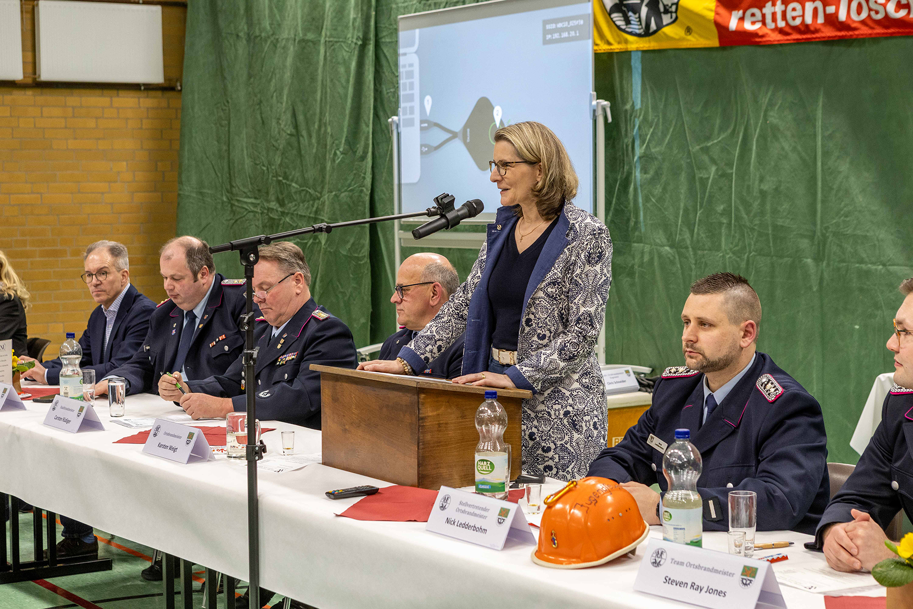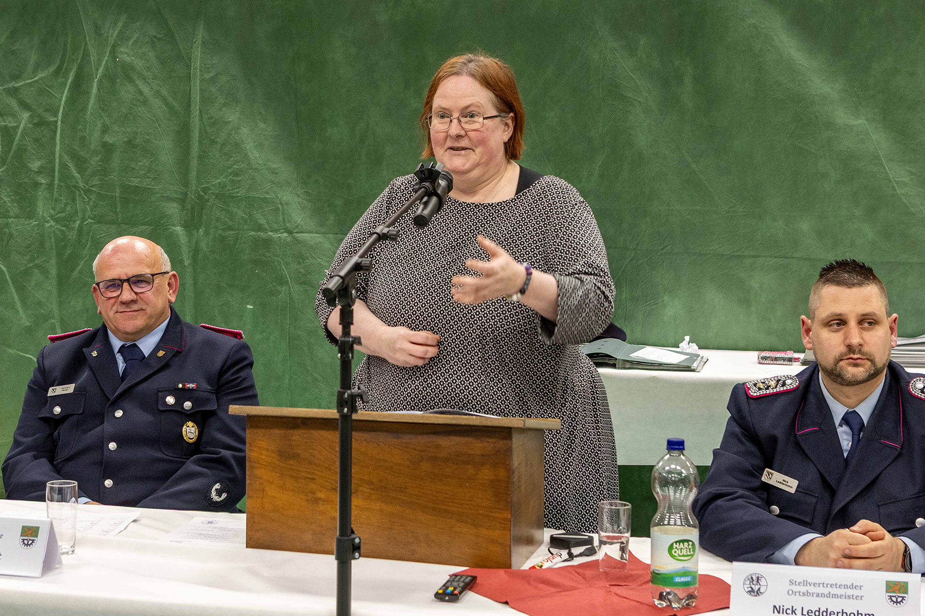 Unter den Gästen waren Burgwedels Bürgermeisterin Ortrud Wendt, Ordnungsamtsleiterin Andrea Stocker und Sachbearbeiterin Michaela Greite, Ortsbürgermeister Michael Kranz, Brandschutzabschnittsleiter Volker Kluth, Stadtbrandmeister Carsten Rüdiger und die beiden stellvertretenden Stadtbrandmeister Florian Leisenberg und Tibor Biczók sowie Pastorin Reni Kruckemeyer-Zettel.