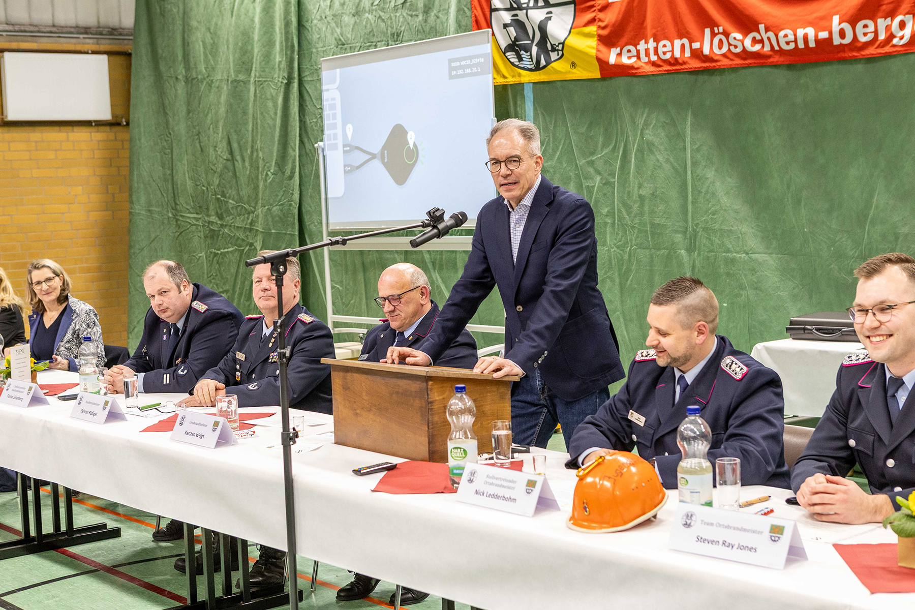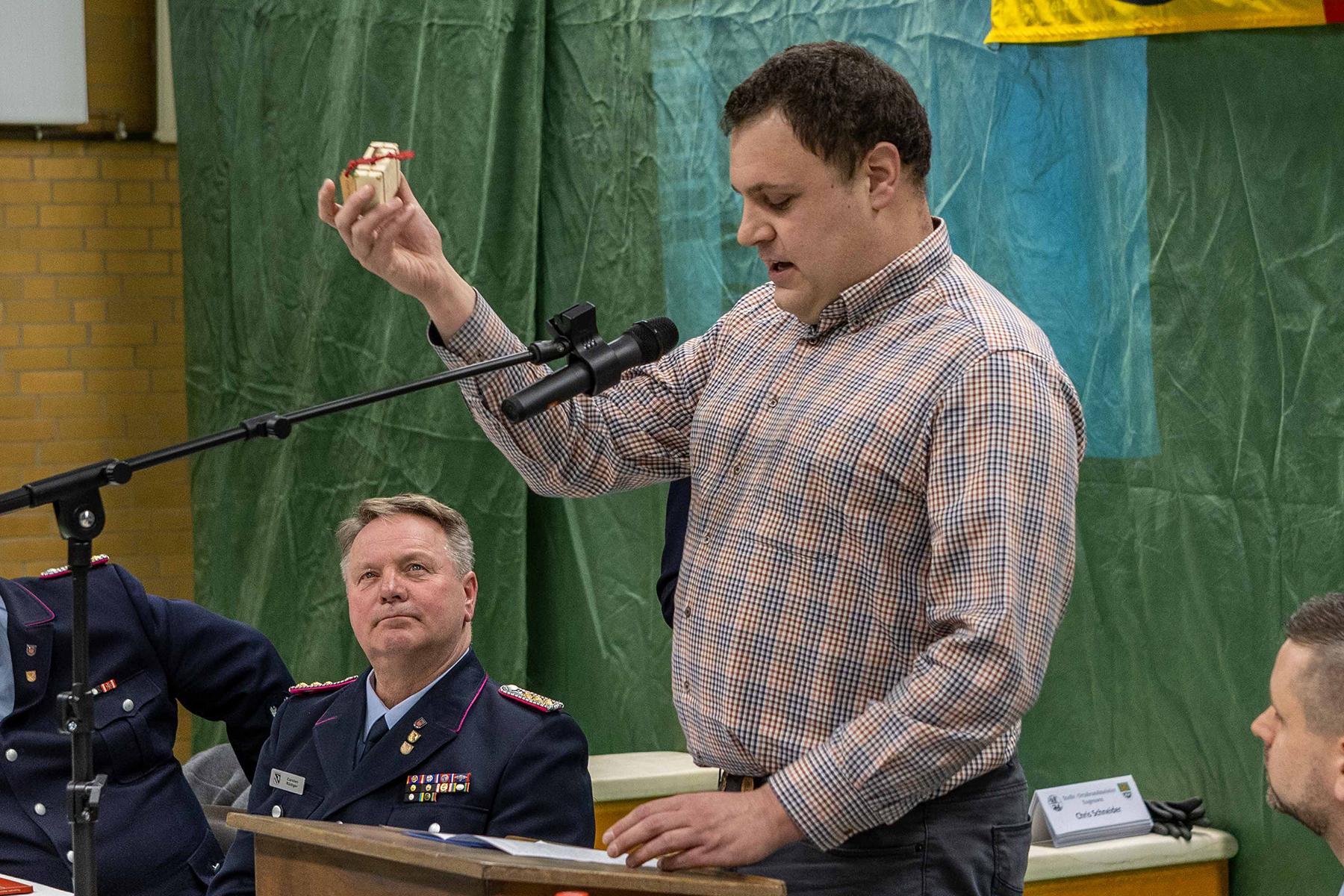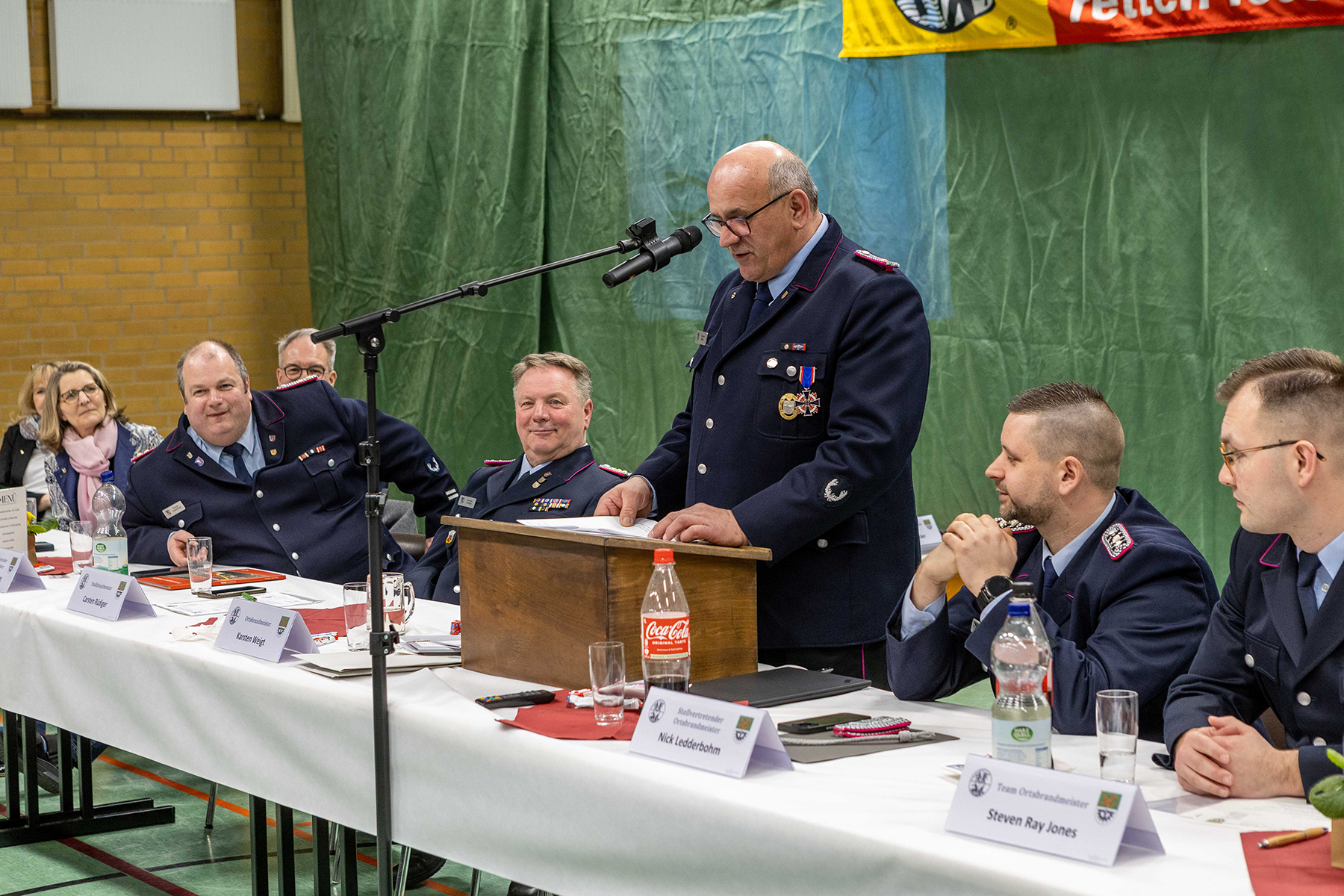 An die neuen Führungskräfte Nick Ledderbohm und Steven Ray Jones gewandt: „Danke, dass sie hier die Feuerwehr übernehmen möchten – mit allen Vor- und Nachteilen.“