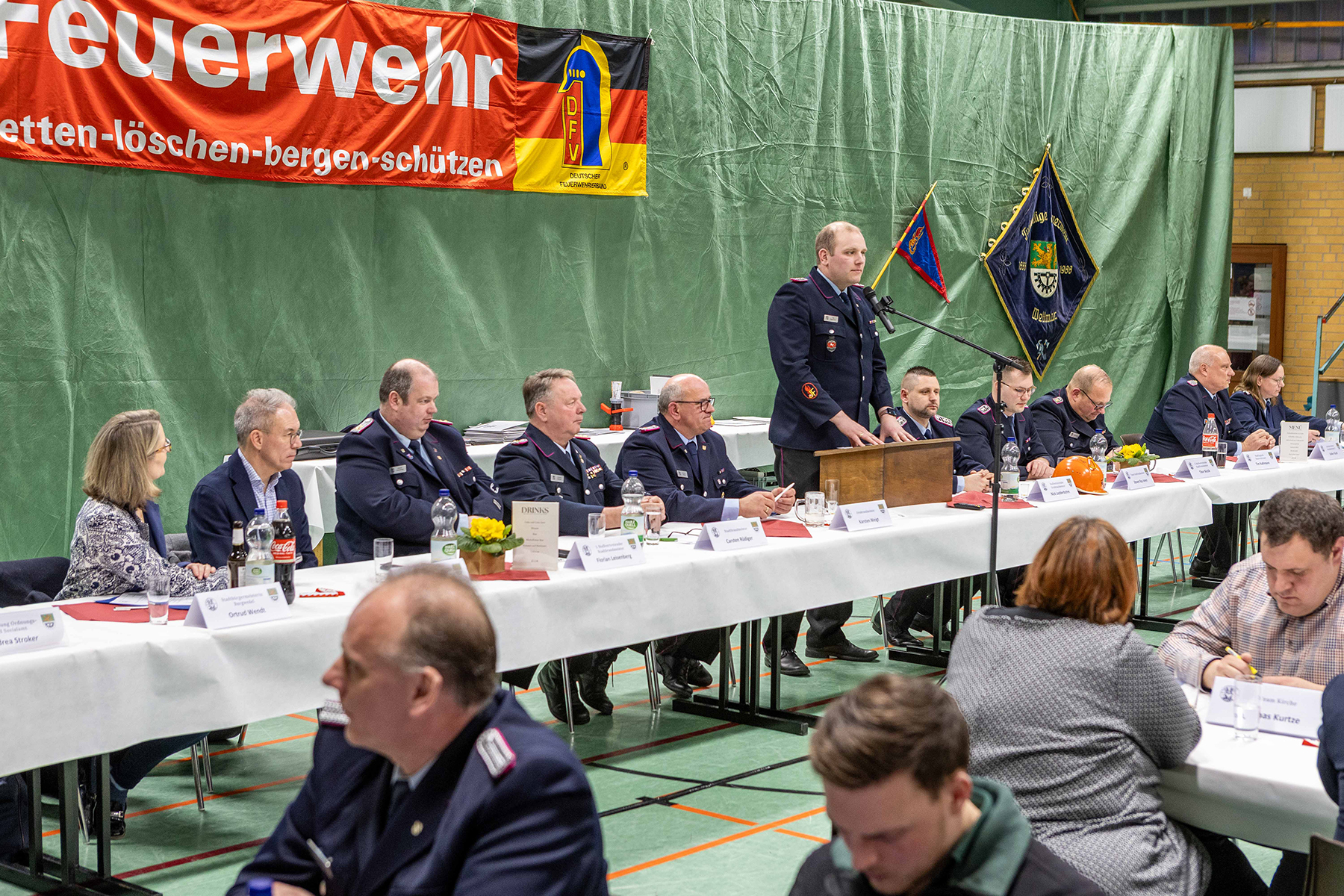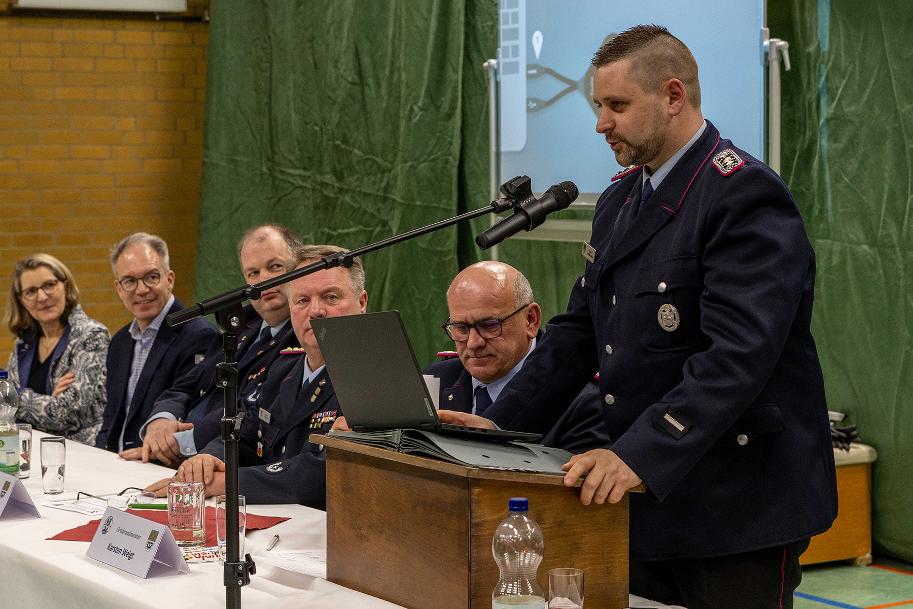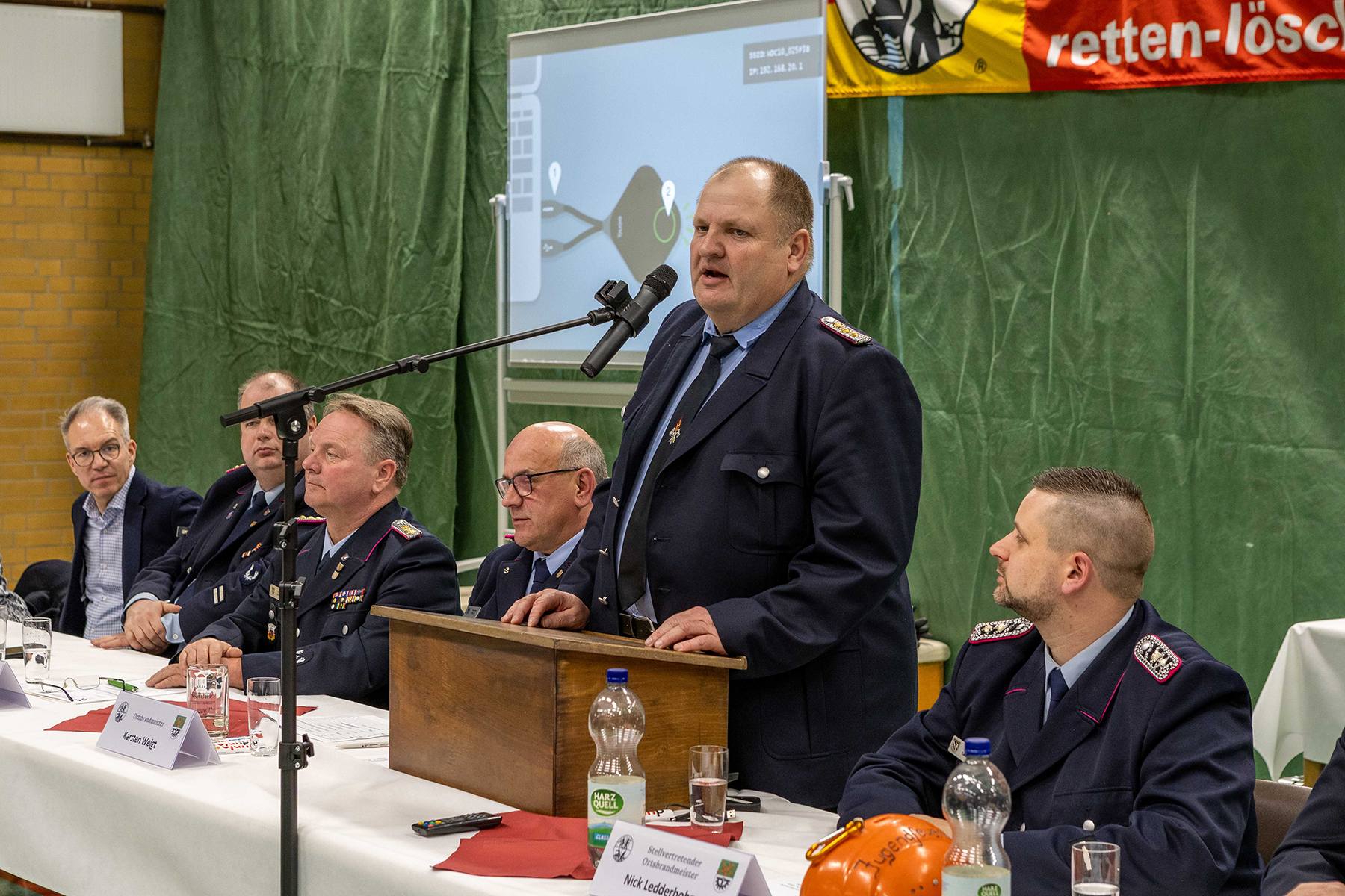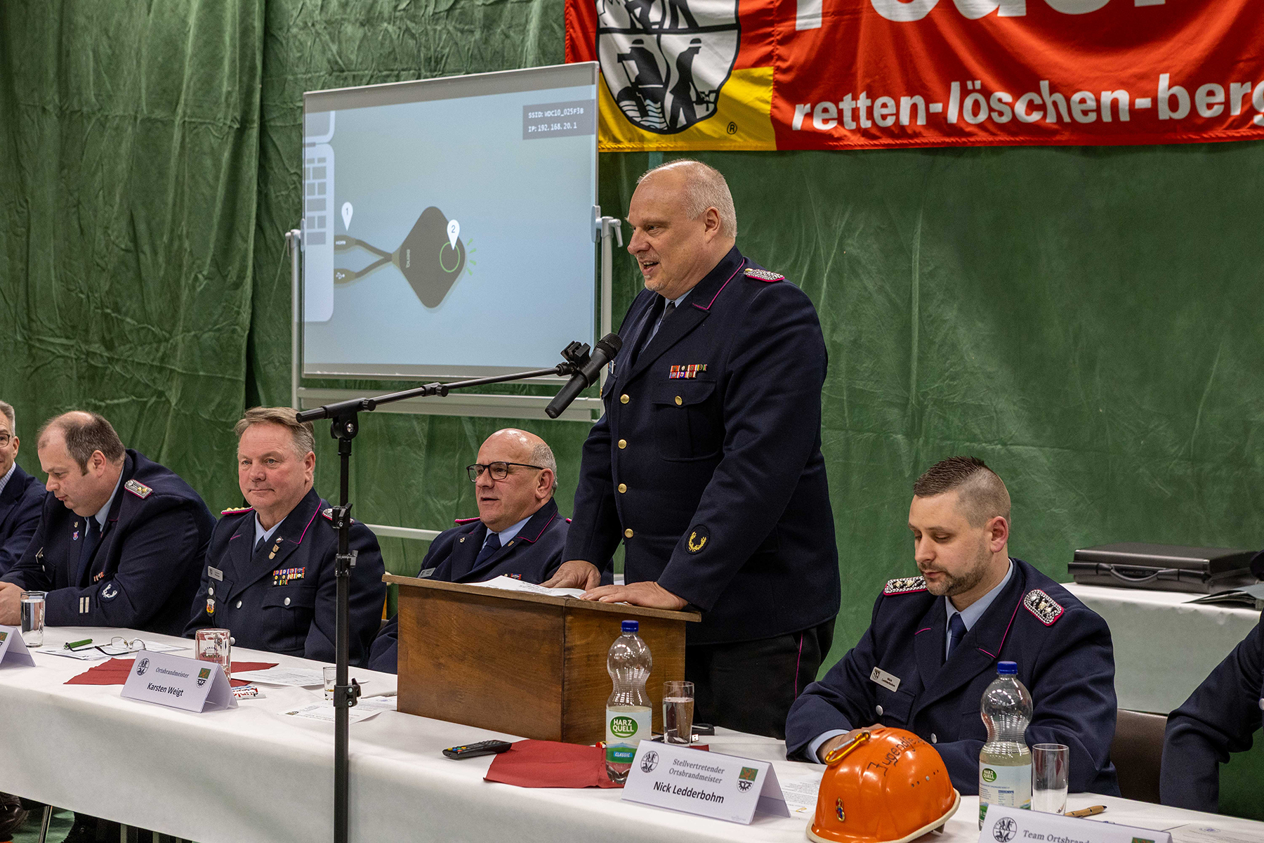 Im Jahresbericht – letztmalig von Noch-Ortsbrandmeister vorgetragen – berichtete er über die Aktivitäten 2025. Die Übungsdienste wurden von den Gruppenführern Steven Ray Jones und Steven Kallinna in der ersten Gruppe, Christopher Krohn und Jan Rahmann in der zweiten Gruppe durchgeführt. Um die dritte Gruppe kümmerte sich Peter, um die vierte Gruppe – „die etwas reiferen Herren“ – Klaus-Dieter Thien und Holger Stoltenberg.