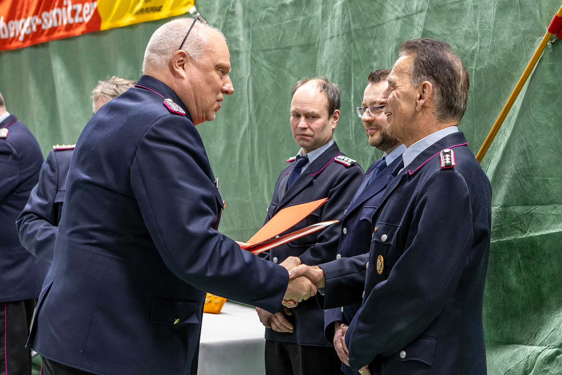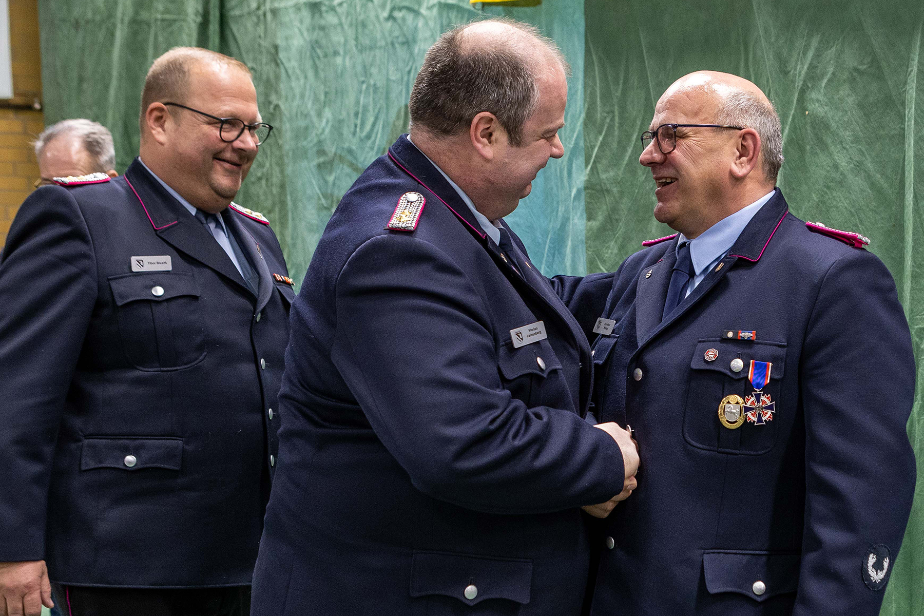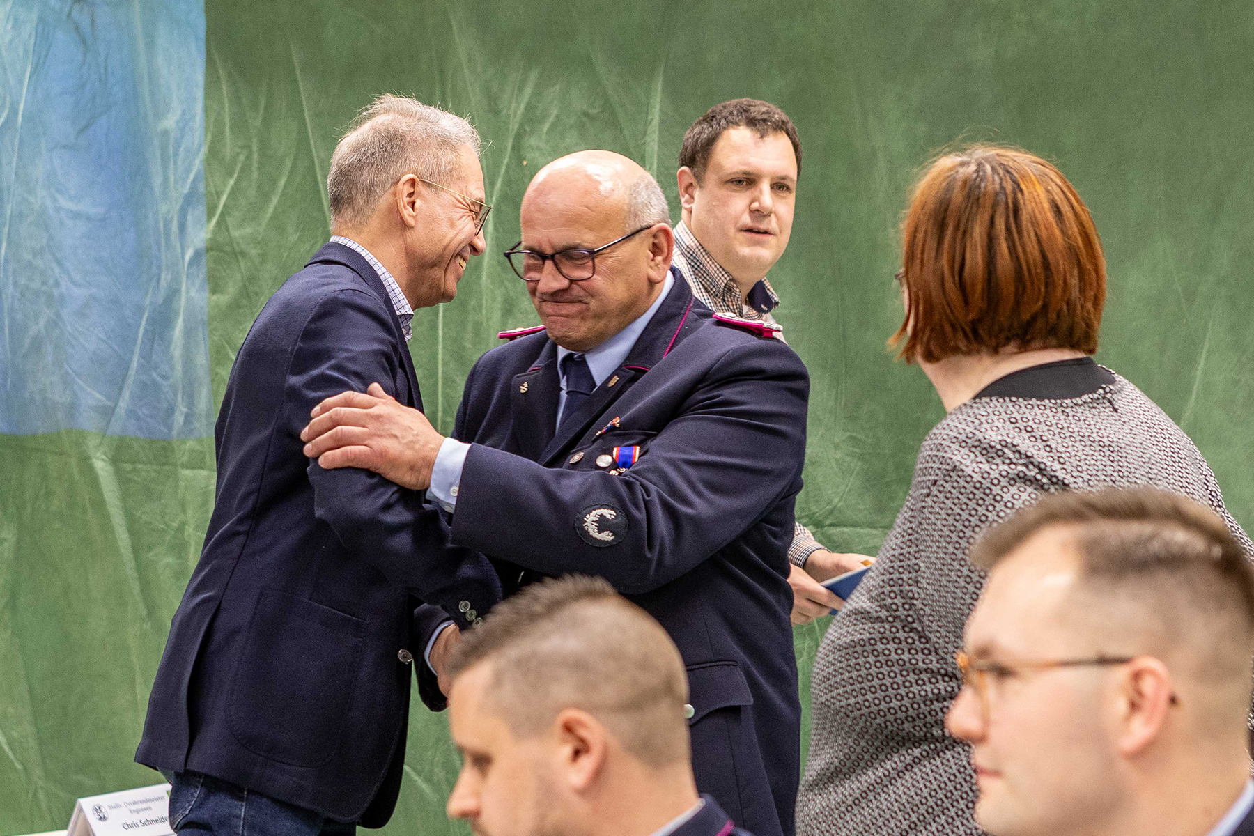 Weigt dankte zahlreichen Weggefährten namentlich: Seinen Vorgängern Heinz-Jürgen, Heiner Lange, Klaus Rieckenberg und Bruno, „die mich geprägt haben und von denen ich viel lernen durfte.“ Ingo Bähre, seinen langjährigen Stellvertreter – „wir mussten uns trennen und nun hat er auch die Feuerwehr verlassen.“ Holger, seinen besten Freund, „der mir oft genug den Spiegel vorgehalten hat.“