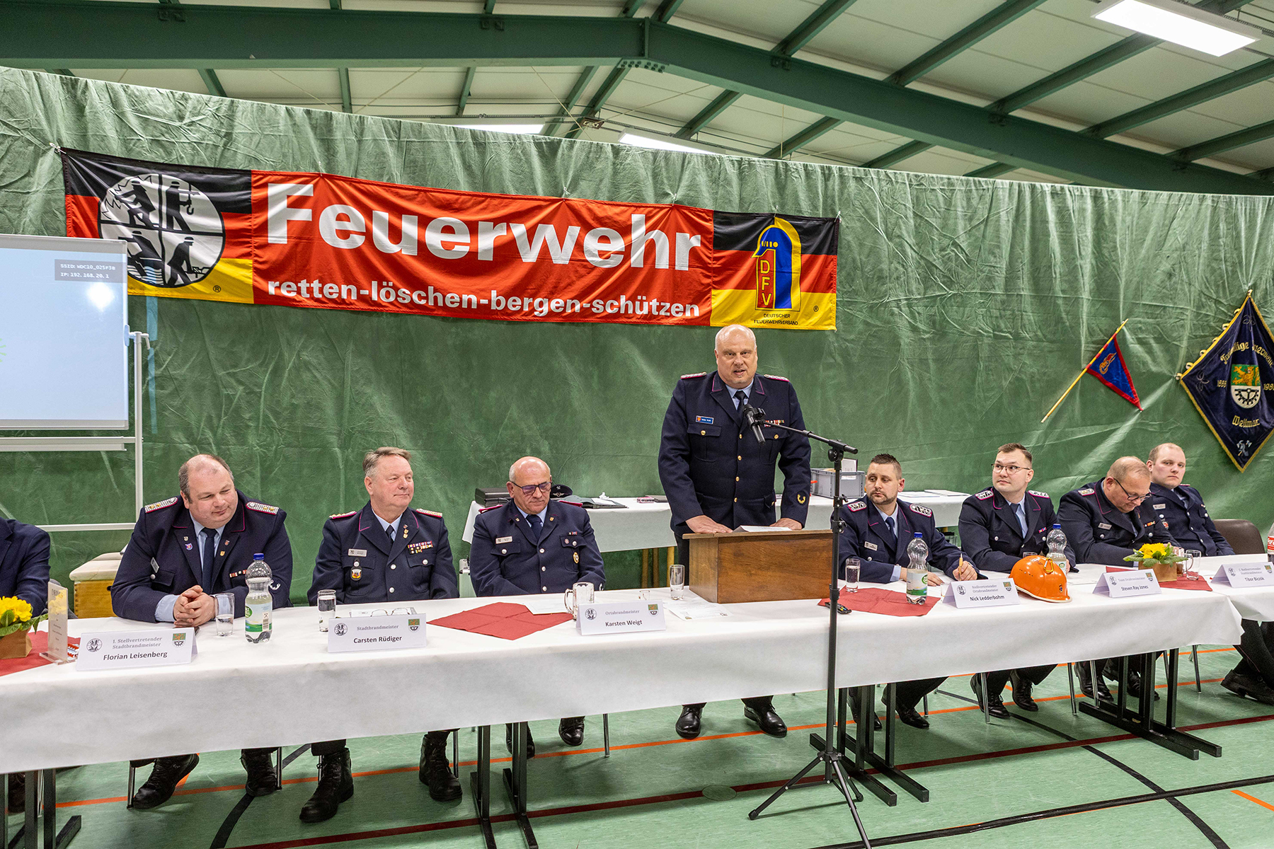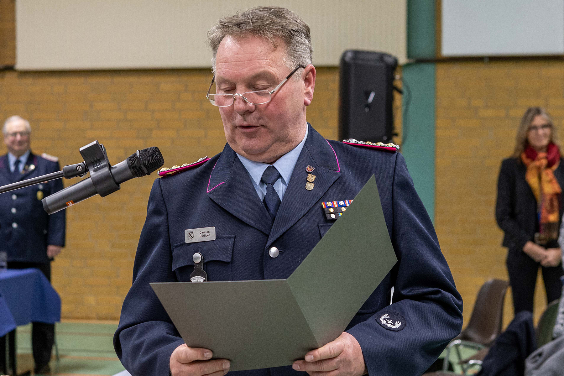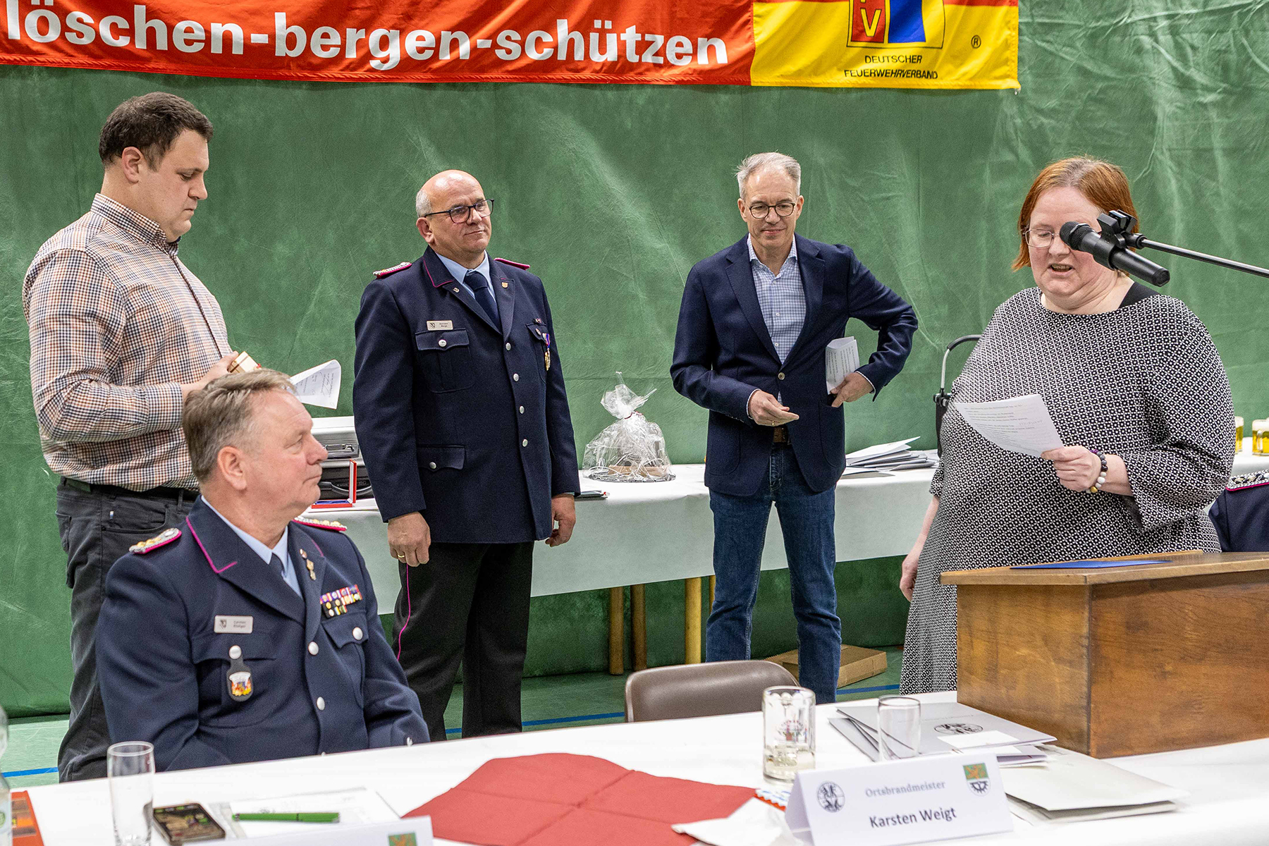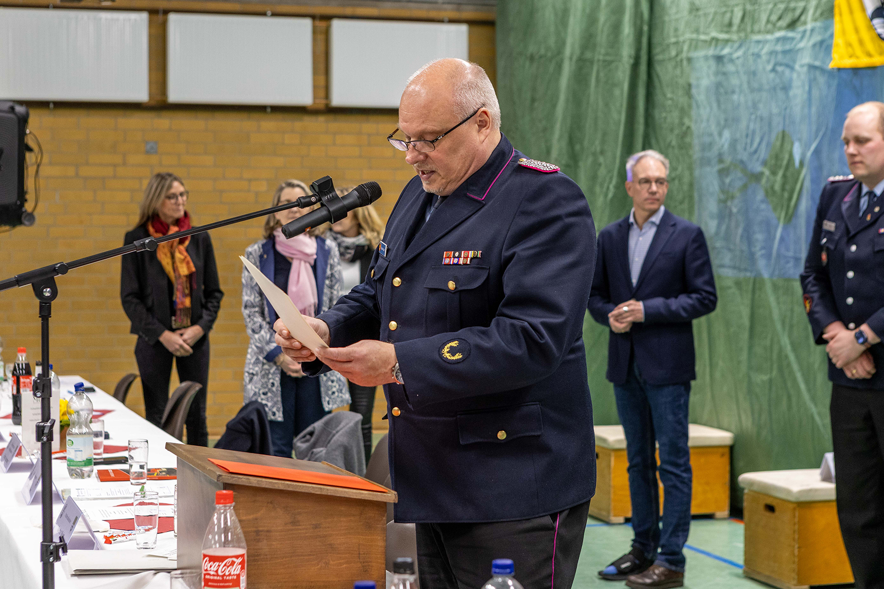 Weigt dankte zahlreichen Weggefährten namentlich: Seinen Vorgängern Heinz-Jürgen, Heiner Lange, Klaus Rieckenberg und Bruno, „die mich geprägt haben und von denen ich viel lernen durfte.“ Ingo Bähre, seinen langjährigen Stellvertreter – „wir mussten uns trennen und nun hat er auch die Feuerwehr verlassen.“ Holger, seinen besten Freund, „der mir oft genug den Spiegel vorgehalten hat.“
