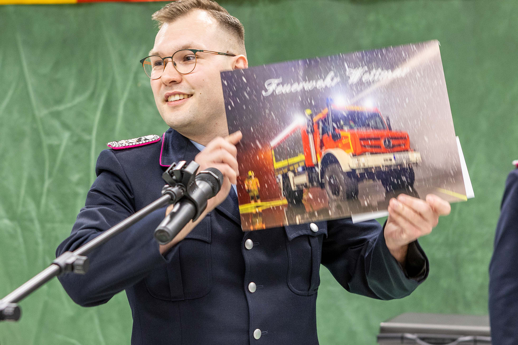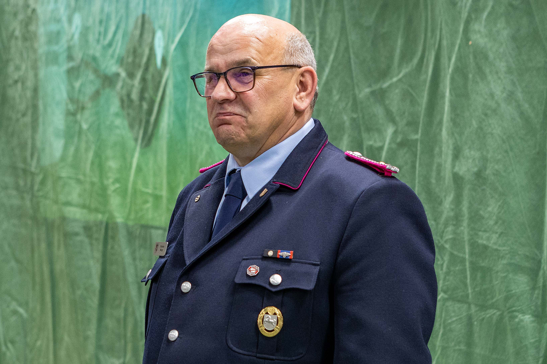 In seiner Abschiedsrede unter dem Titel „Der Abschied vom Sturm Elly“ blickte Karsten Weigt auf seine 15-jährige Amtszeit zurück. „Ich bin hier als Ortsbrandmeister durch verschiedene Umstände reingerutscht – eigentlich wollte ich diesen Job nicht, meine Frau erst recht nicht“, begann er. „Aber erstens kommt es anders und zweitens als man denkt.“