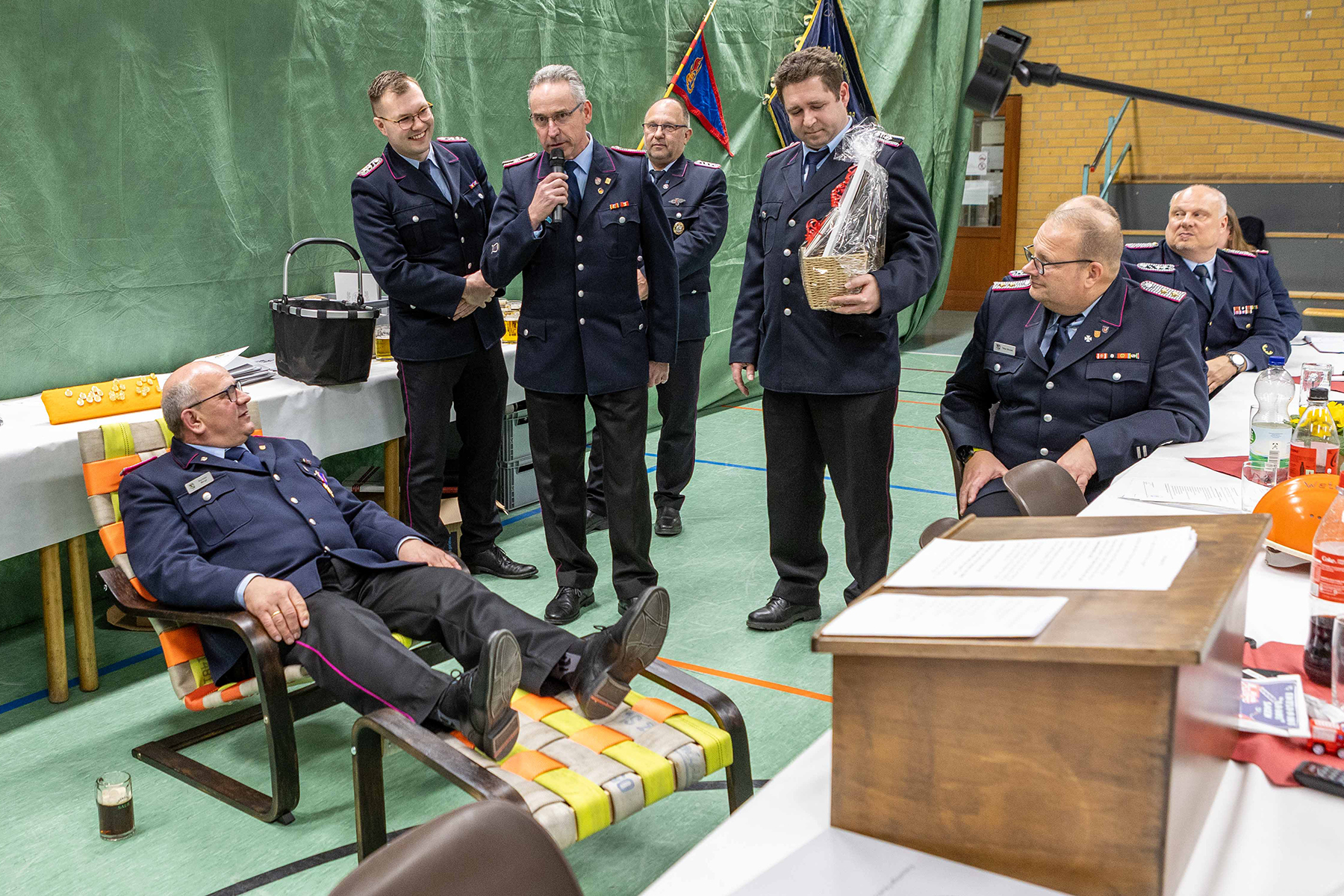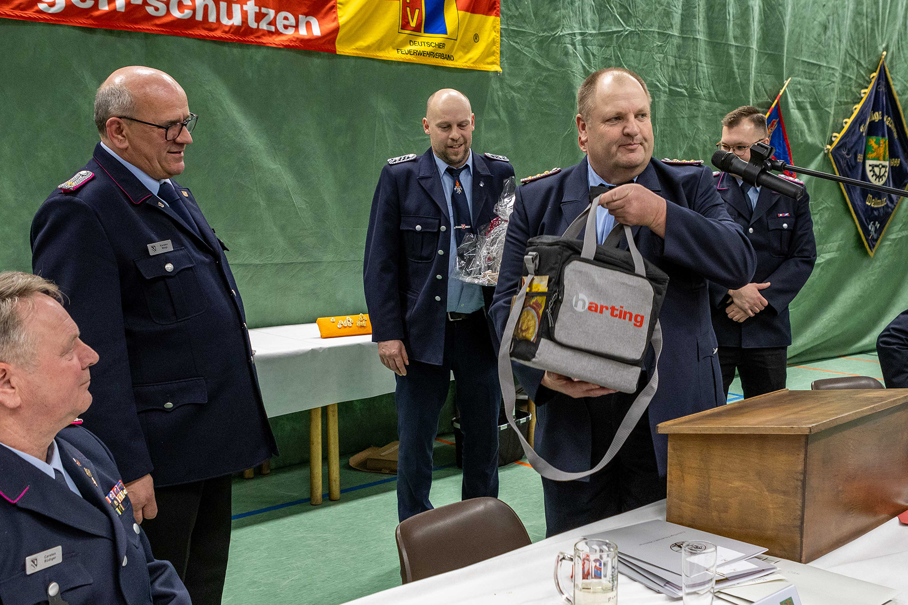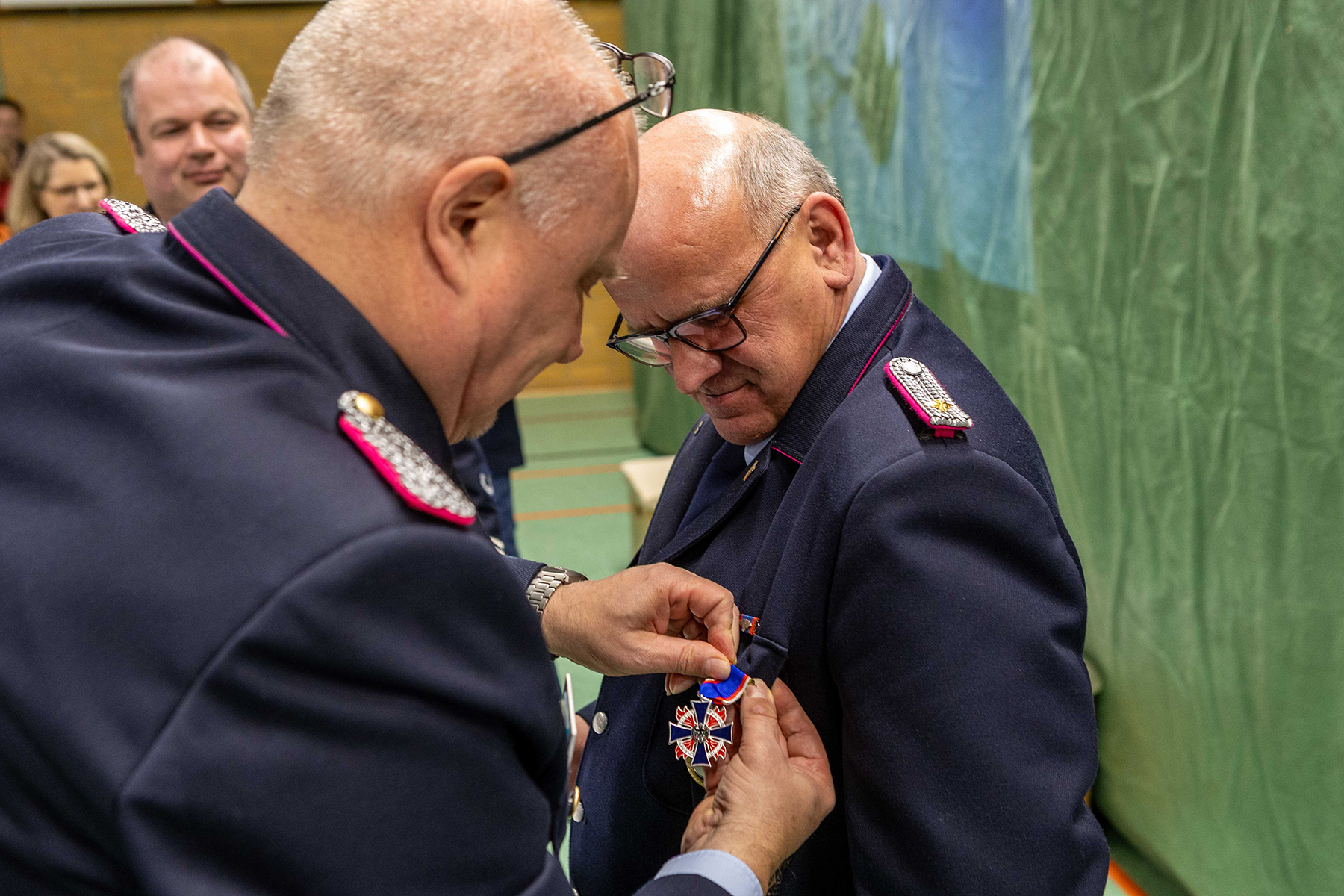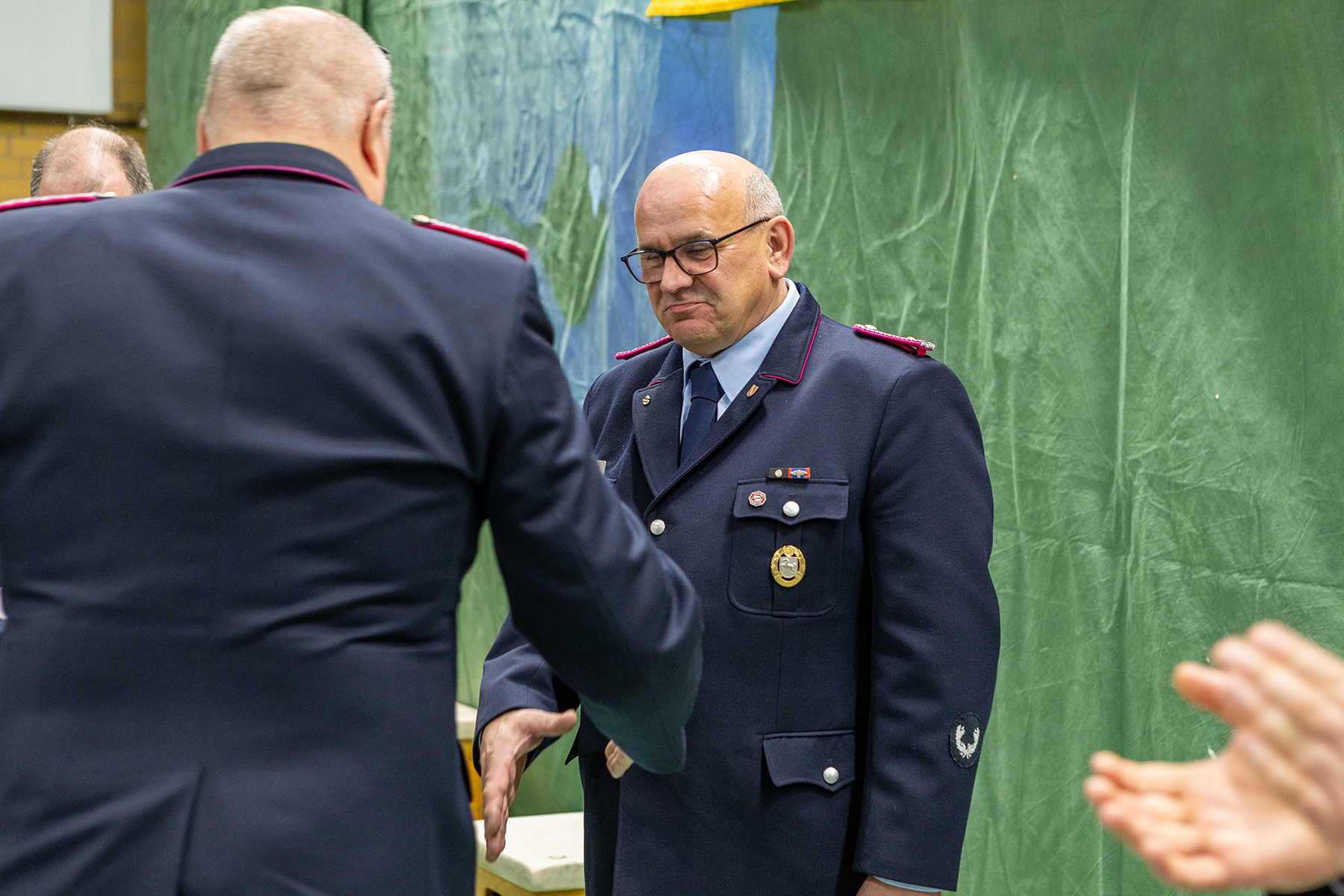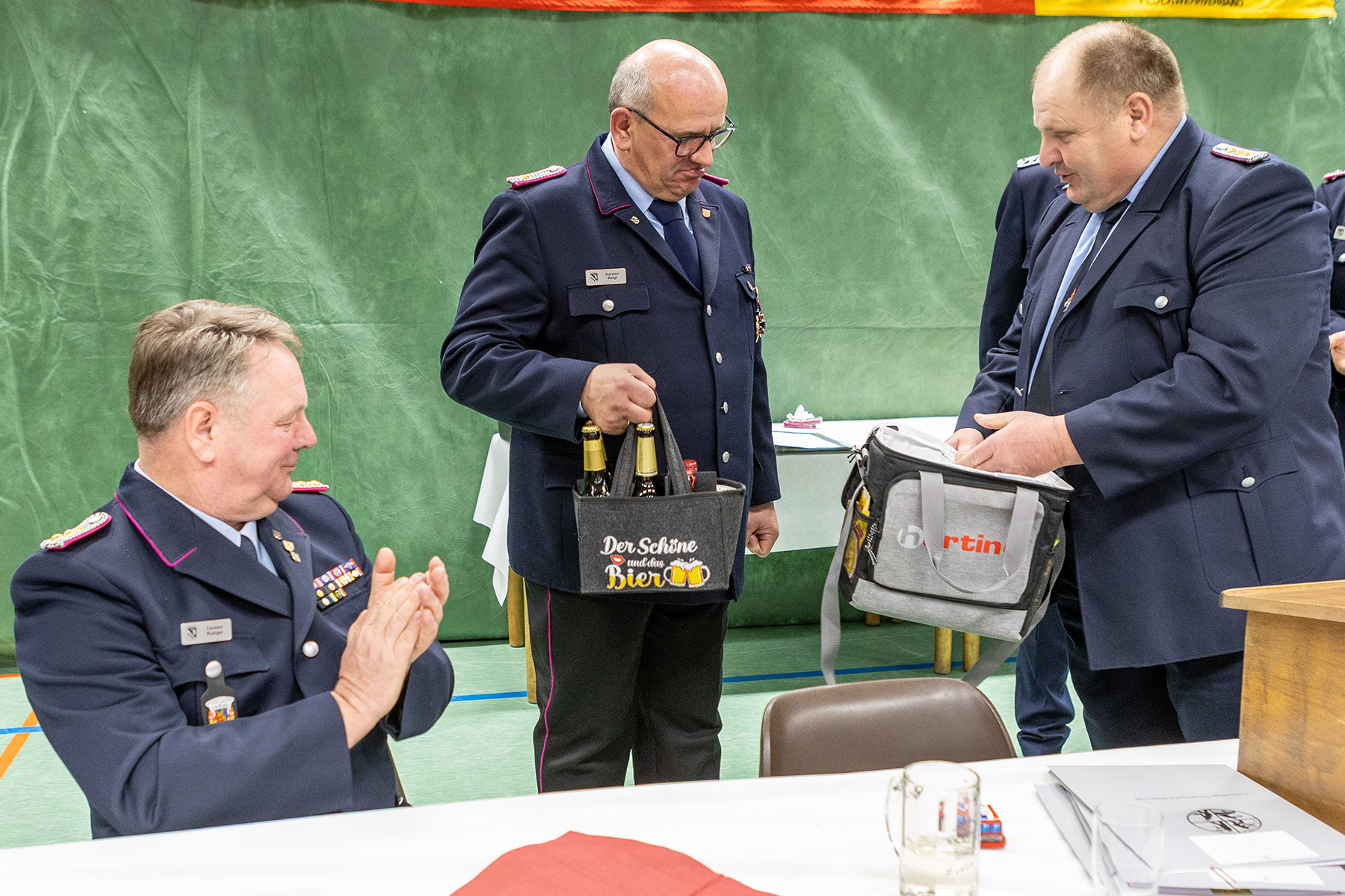 Für seine besonderen Verdienste um das Feuerlöschwesen wurde Karsten Weigt – sichtlich gerührt – durch Brandschutzabschnittsleiter Volker Kluth mit dem Deutschen Feuerwehr-Ehrenzeichen in Silber ausgezeichnet. Er erhielt zum Abschied stehenden Applaus und zum Abschied aus dem Amt des Ortsbrandmeisters viele Geschenke, darunter einen Liegestuhl.