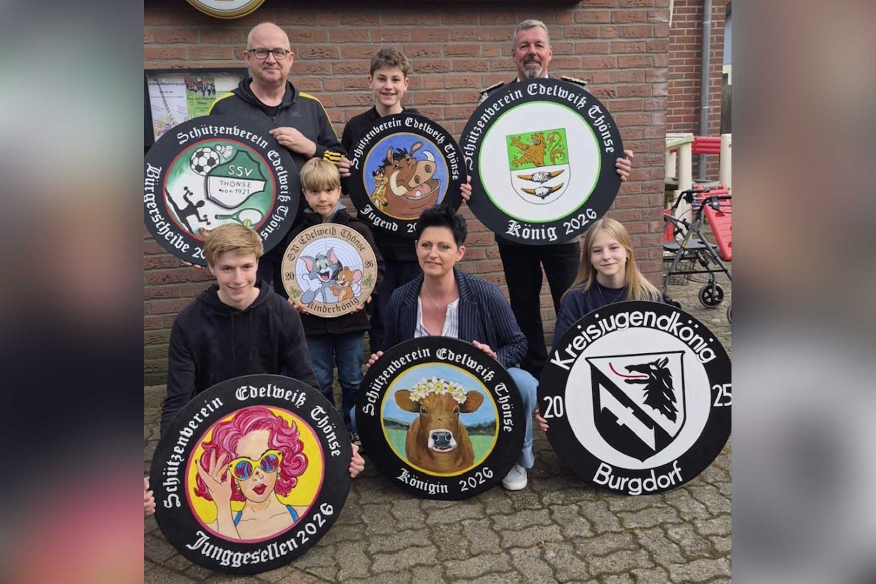 Zu den Majestäten des Jahres 2026 gehören König Axel Goldbaum, zugleich 1. Vorsitzender des Vereins, Königin Cyndia Goldbaum, Junggesellenkönig Laurenz Behrens, Jugendkönig Jonah Krohn, Kinderkönig Noah Emmerich und Bürgerkönig Alexander Floto.