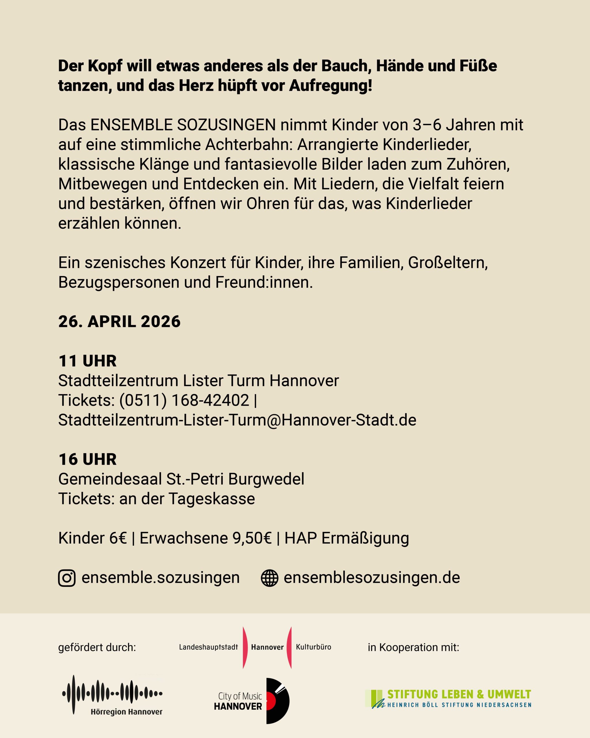 Die Sängerinnen des Ensembles „Sozusingen“ aus Hannover sind am Sonntag, 26. April 2026, im Gemeindehaus von St. Petri in Großburgwedel zu Gast. Auf dem Programm steht ein Kinderkonzert für Mädchen und Jungen im Alter von drei bis sechs Jahren sowie deren Eltern.